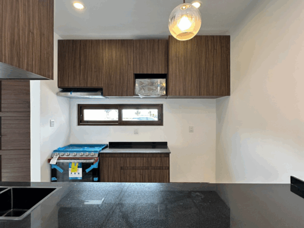 Cocina equipada con estufa, campana, microondas y barras de granito